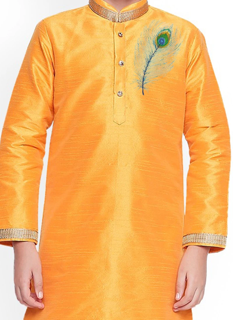 Yellow dupion silk kurta pyjama crafted with close collar neck with lace work and full sleeves enriched with peacock designs printed work is representing a royalty in itself. This kurta pyjama comes with white dupion silk with zari border dhoti pant bottom.