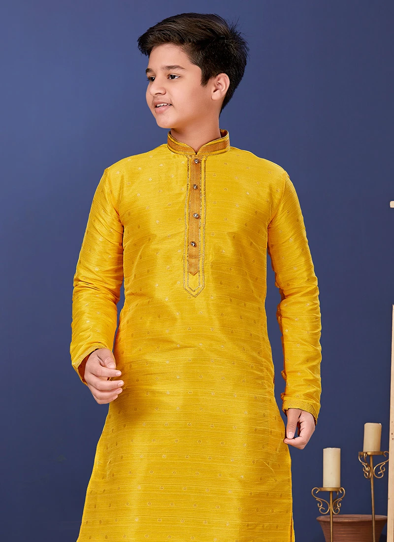 Style and trend will be at the peak with this yellow mulberry butti silk kids boys kurta pyjama crafted with close collar neck and full sleeves. The jacquard work a significant feature of this attire. This kurta Pyjama comes with red dupion silk chudi style pant bottom.
